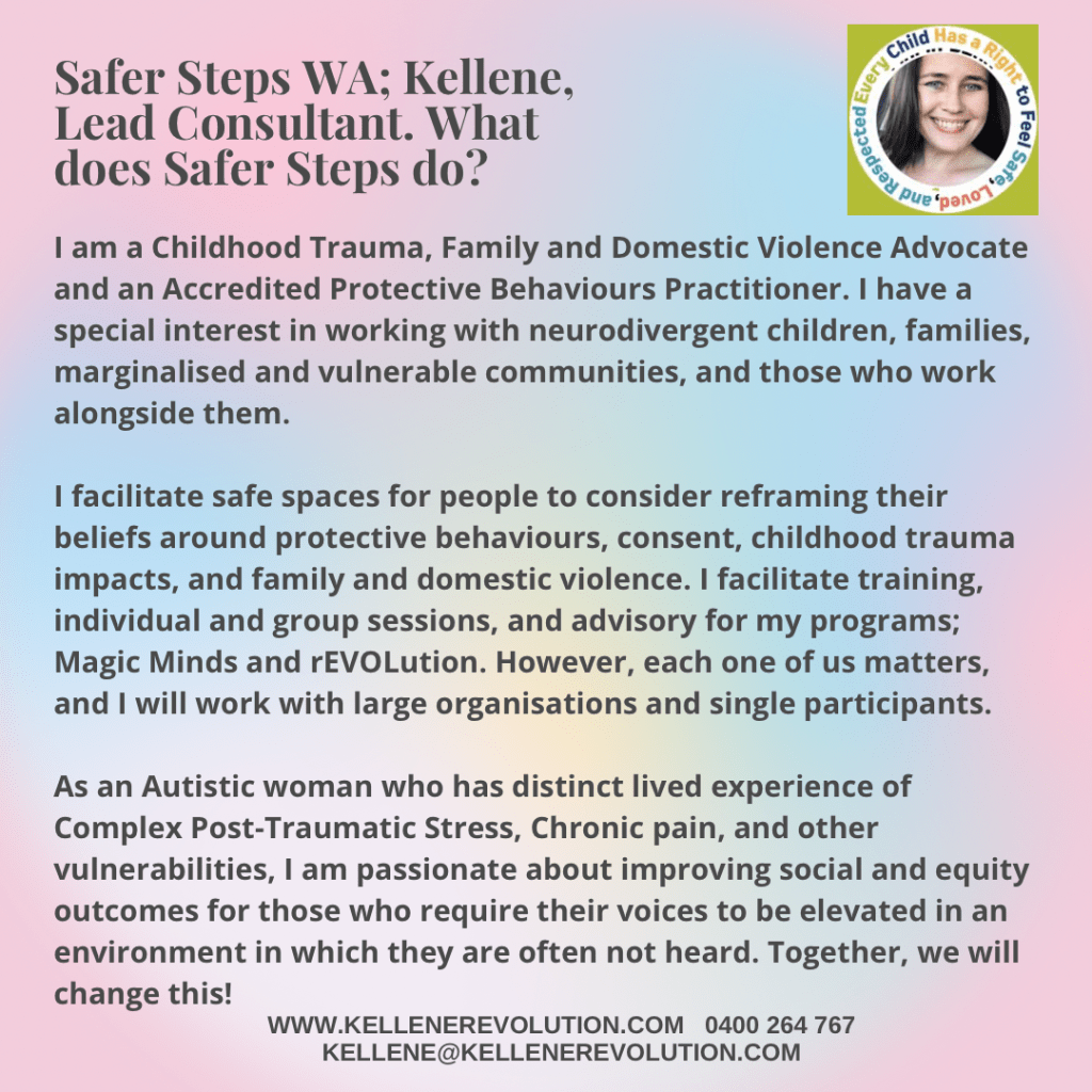 Kellene is a Childhood Trauma, Family and Domestic Violence Advocate and an Accredited Protective Behaviours Practitioner. Kellene has a special interest in working with neurodivergent children, families, marginalised and vulnerable communities and those who work alongside them.